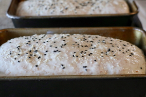 7 – Brush the insides of the bread pans with oil and transfer the divided and kneaded doughs into them. Form the dough to the pan size with your fingers. Brush generously the surface of the dough with the topping liquid and spread the sesame seeds evenly. The topping liquid bounds the sesame seeds to the bread surface. Without topping liquid, the seeds drop off the bread after it is cooked. At this stage the dough covers half of the bread pan. Then let the dough to rise for the second time. After the second rise the bread pan becomes almost full.