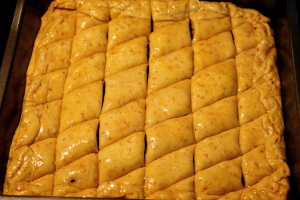 Then cut the cake in your desired form with a sharp knife. Diamond pattern of 1 inch is the traditional shape.